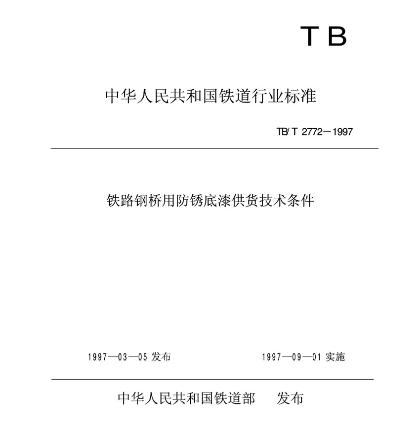 TB/T 2772-1997鐵路鋼橋用防銹底漆供貨技術(shù)條件標(biāo)準(zhǔn) TB 中華人民共和國鐵道行業(yè)標(biāo)準(zhǔn) TB/T 2772-1997鐵路鋼橋用防銹底漆供貨技術(shù)條件 1997-03-05發(fā)布 1997-09-01實施 中華人民共和國鐵道部 發(fā)布 本標(biāo)準(zhǔn)規(guī)定了鐵路鋼橋各涂裝體系防銹底漆的產(chǎn)品分類、技術(shù)要求、試驗方法、檢驗規(guī)則及包裝、標(biāo)志、運輸和貯存。本標(biāo)準(zhǔn)適用于新建鋼梁涂裝和運營中鋼梁重新涂裝及維護(hù)涂裝使