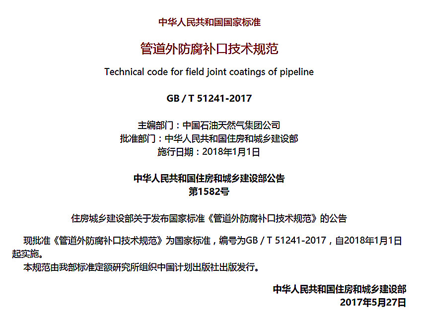 管道外防腐涂料補(bǔ)口標(biāo)準(zhǔn)GB/T 51241-2017