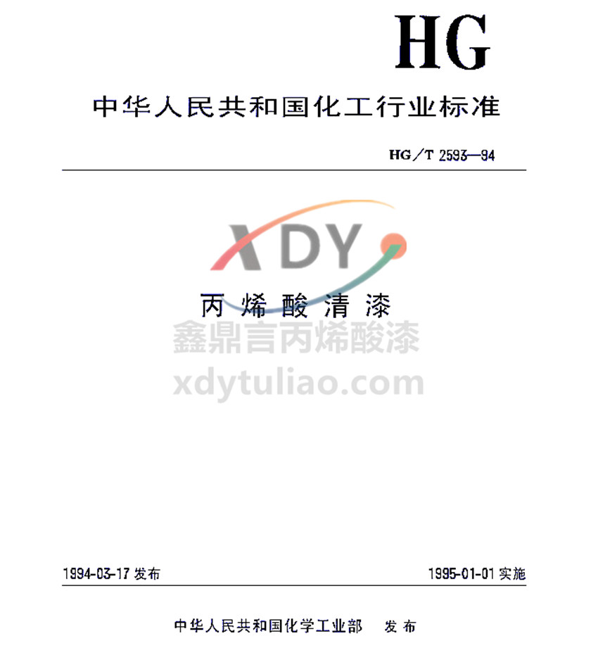 丙烯酸清漆HG/T 2593-1994代替ZBG 51072-87 中華人民共和國化工行業(yè)標(biāo)準(zhǔn) 丙烯酸清漆 1994-03-17發(fā)布 1995-01-01實(shí)施 中華人民共和國化學(xué)工業(yè)部 發(fā)布 本標(biāo)準(zhǔn)規(guī)定了丙烯酸清漆的技術(shù)要求、試驗(yàn)方法、檢驗(yàn)規(guī)則、包裝、標(biāo)志、貯存、運(yùn)輸?shù)。本?biāo)準(zhǔn)適用于經(jīng)陽極化處理的鋁合金或其他金屬表面的裝飾與保護(hù)的丙烯酸清漆。本標(biāo)準(zhǔn)規(guī)定的丙烯酸清漆分為兩個(gè)類型。Ⅰ型產(chǎn)品:由甲基丙烯
