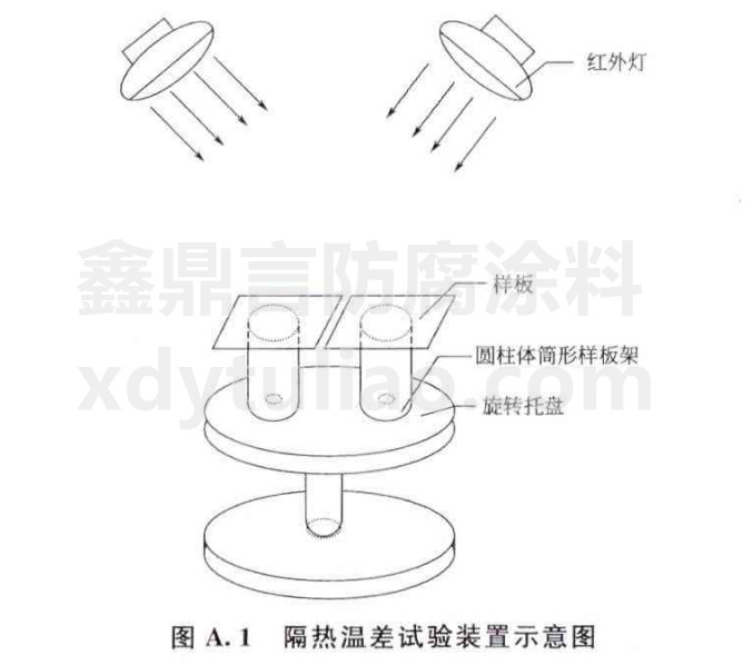 A.3.2、試驗(yàn)在18℃—27℃的環(huán)境條件下進(jìn)行。在旋轉(zhuǎn)托盤上放置圓柱體筒形樣板架,圓柱體筒形樣板架的中心應(yīng)對準(zhǔn)托盤上圓孔的中心;將1塊試板及1塊空白試板放在圓柱體筒形樣板架上,兩塊板之間間隔5mm,試板有涂層的面向上,空白試板經(jīng)過噴砂或拋丸的面向上;在旋轉(zhuǎn)托盤的上方0.5m處,安裝2只紅外燈,紅外燈與旋轉(zhuǎn)托盤邊緣的水平距離為15cm,紅外燈的加熱面軸向與試板平面成75°。