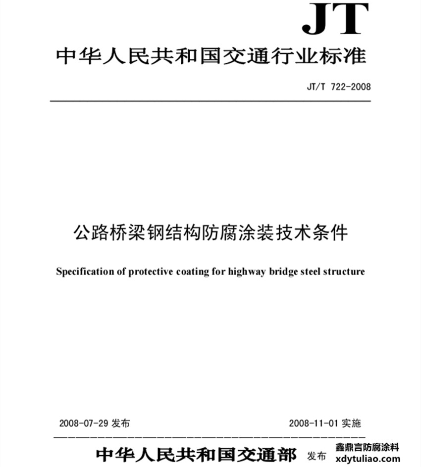 JT/T 722-2008公路橋梁鋼結(jié)構(gòu)防腐涂裝技術(shù)條件標(biāo)準(zhǔn)規(guī)定了公路橋梁鋼結(jié)構(gòu)防腐涂裝的分類、要求、試驗(yàn)方法、檢驗(yàn)規(guī)則、安全、衛(wèi)生和環(huán)境保護(hù)以及驗(yàn)收的要求。 JT/T 722-2008標(biāo)準(zhǔn)適用于公路橋梁鋼結(jié)構(gòu)防腐涂裝,其它應(yīng)用領(lǐng)域的橋梁鋼結(jié)構(gòu)或類似條件下的鋼結(jié)構(gòu)防腐涂裝也可參照執(zhí)行。