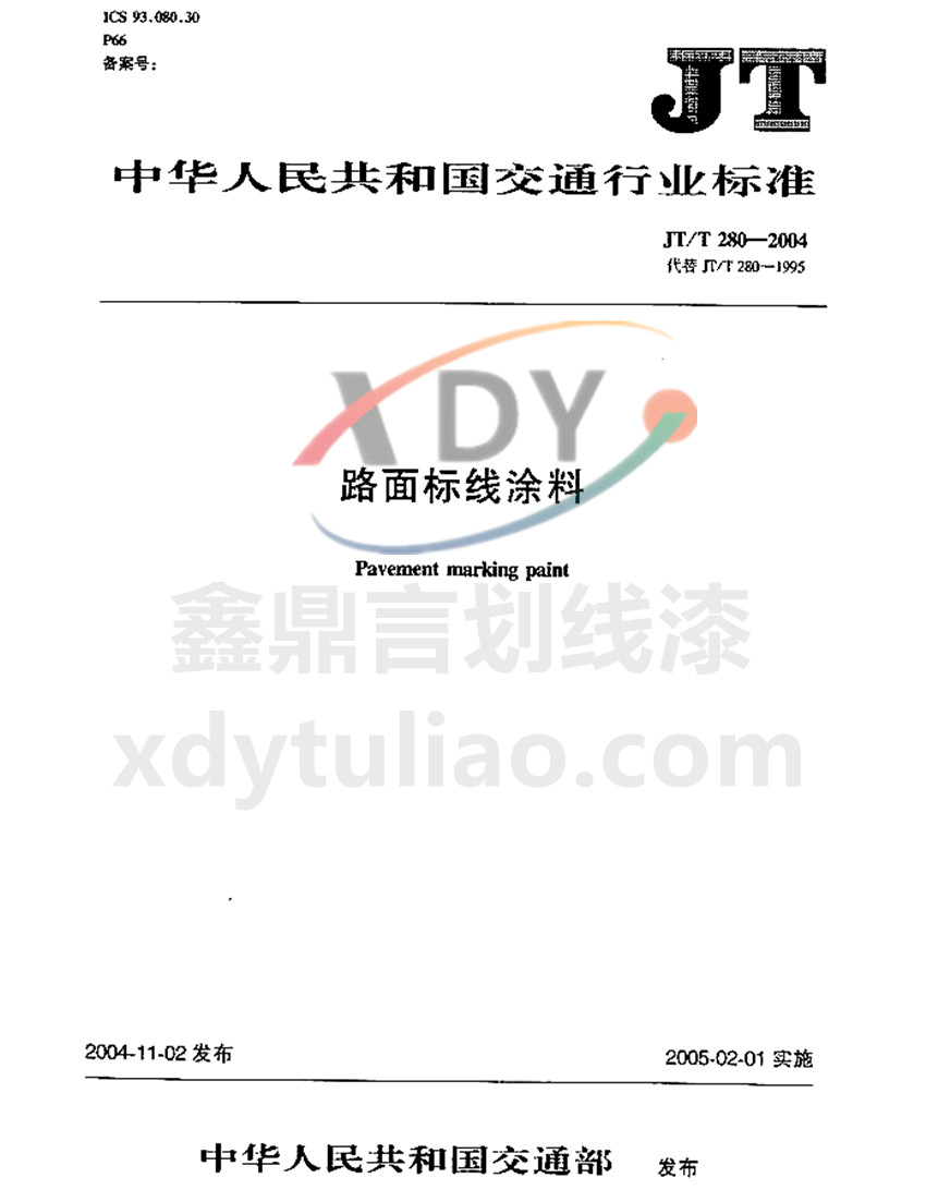 JT/T 280-2004路面標線涂料標準是防腐涂料小編照搬JT/T 280-2004《路面標線涂料》紙質版內容,大家可以放心參考。更多防腐涂料執(zhí)行國家和行業(yè)標準等防腐涂料相關信息可以參考官網(wǎng):www.tuyaojiu.cn ICS 93.080.30 P66 JT 中華人民共和國交通運輸行業(yè)標準 JT/T 280-2004路面標線涂料Pavement